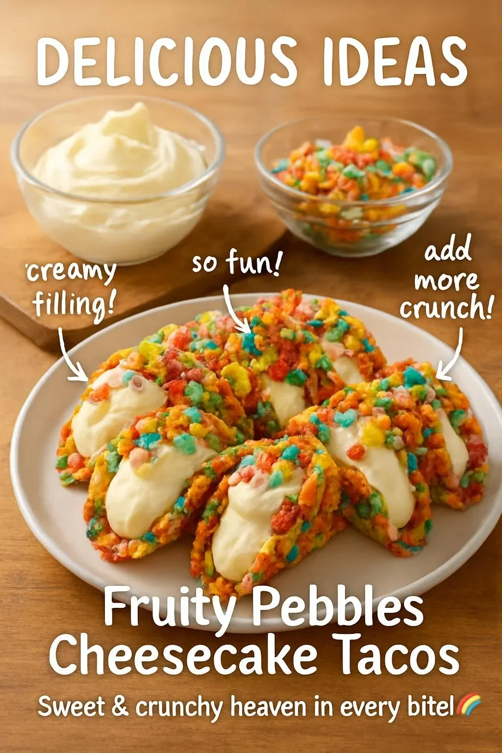 - This dish combines 3 cups Fruity Pebbles cereal, 8 oz cream cheese (softened), 1 cup powdered sugar, 1 tsp vanilla extract, whipped cream for topping, and extra Fruity Pebbles for garnish to create colorful, crunchy taco shells filled with a silky cheesecake mixture.