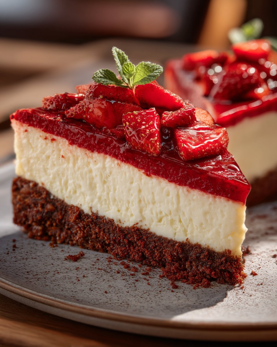 I still remember the first time I made this Red Velvet Strawberry Cheesecake for my family’s summer picnic: the kitchen smelled like cocoa and vanilla, my hands were dusted with powdered sugar, and my grandma insisted on sampling a slice before it even cooled. That bite — moist, tender red velvet layered with creamy cheesecake and bright fresh strawberries — felt like the best of celebrations in one forkful. This dessert blends the Southern charm of red velvet cake with the classic American love of cheesecake and strawberry shortcake, making it a perfect centerpiece for birthdays, holidays, or any day you want to make special.